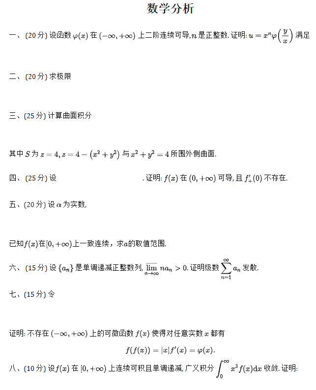2023南开大学数学分析考研试题最新分享,考试题型有计算题、证明题、解答题等,考研试题可以帮助我们分析考试重难点,抓住常考知识点,找到出题重点,想报考南开大学的同学可以看看历年考研试题,做好复习规划,现在就跟着小编一起来看看2023南开大学数学分析考研试题吧!