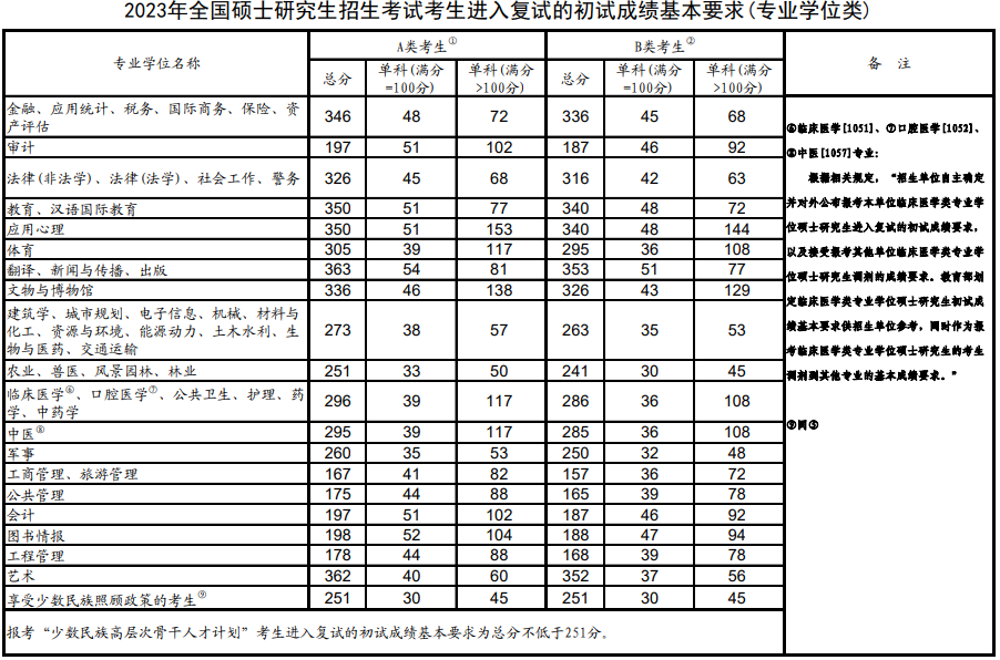 初试成绩需达到教育部划定的二区初试成绩的基本要求,以下就是2023年教育部划定的复试分数线