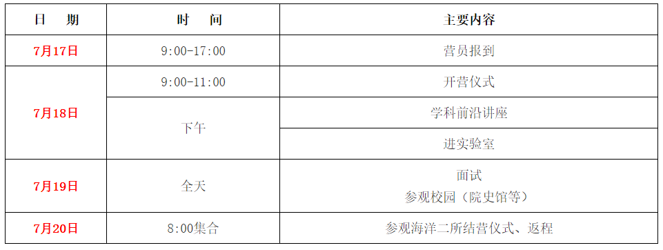 2、录取:海洋学院组织相关老师负责营员的审核和选拔,择优录取。6月中下旬确定入选营员名单,并在申请系统中公布结果,并通过短信通知本人。被录取的同学需在规定日期前按照通知的要求确认是否参营,逾期未确认视为放弃资格。