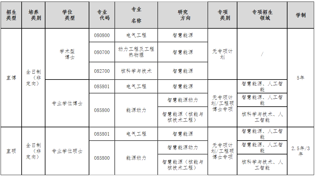 1.学术型:080700 动力工程及工程热物理(智慧能源) / 2. 专业型:085800 能源动力—智慧能源动力 |